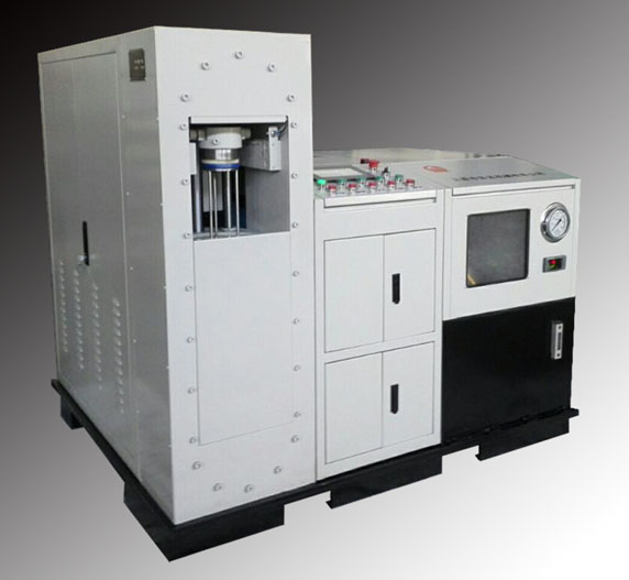 該機(jī)型是將上述幾部分合理組合于一起后外加機(jī)箱罩蓋而成為一體的機(jī)型。擺放在實(shí)驗(yàn)室內(nèi)彰顯整潔美觀和大方。該機(jī)工作腔壓蓋為垂直升降開閉式,其壓蓋內(nèi)設(shè)排氣和應(yīng)急(安全)卸壓裝置;框架固定在底板上,工作缸固定于框架內(nèi)。增壓采用一次增壓完成式增壓器。控制系統(tǒng)采用PLC可編程控制器+觸摸屏顯示,可實(shí)現(xiàn)升壓分段自動控制和全程比例自動卸壓等操控形式。